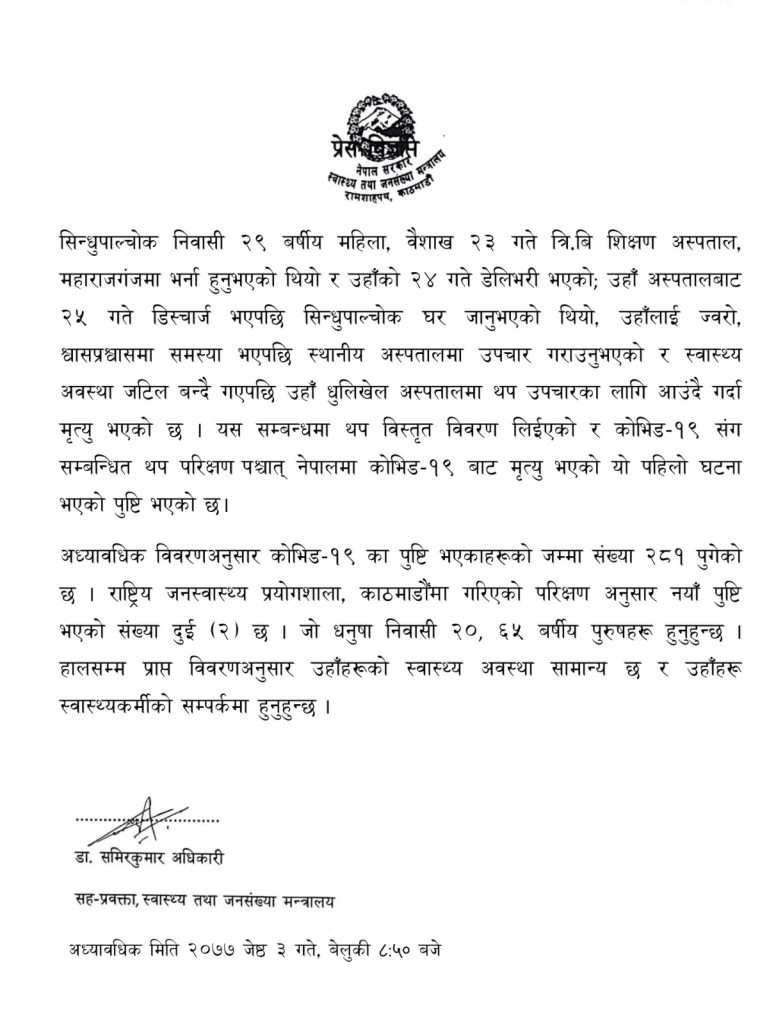टोलीको रिपोर्टका आधारमा मन्त्रालयले उनको मृत्यु कोरोनाका कारण भएको घोषणा गरेको छ ।
