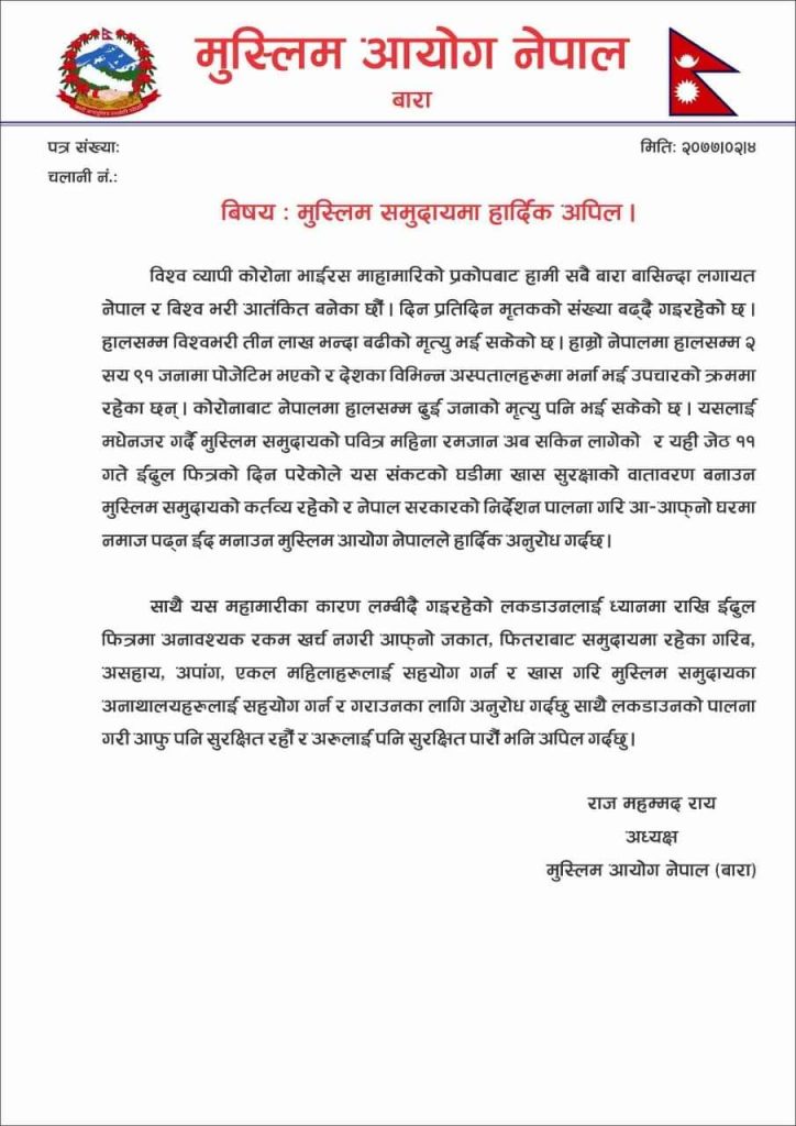 नेपाल मुस्लिम आयोग बाराले मुस्लिम समुदायको महान पर्व इदुलफित्रको दिन घरमै बसेर नमाज पढन र पर्व मनाउन मुस्लिम समु्दायसंग अनुरोध गरेको छ । आयोगका जिल्ला अध्यक्ष राजमहमद रायले सोमबार एक विज्ञप्ति निकालेर बारा जिल्लाबासी मुस्लिम समुदायसंग यस्तो अपिल गर्नुभएको हो ।