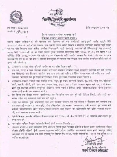 जिल्लामा संक्रमितको संख्या बढ्न थालेसँगै जिल्ला प्रशासन कार्यालय बाराले जिल्लाभरि १५ दिनको लागि निषेधाज्ञा थप गरेको छ ।