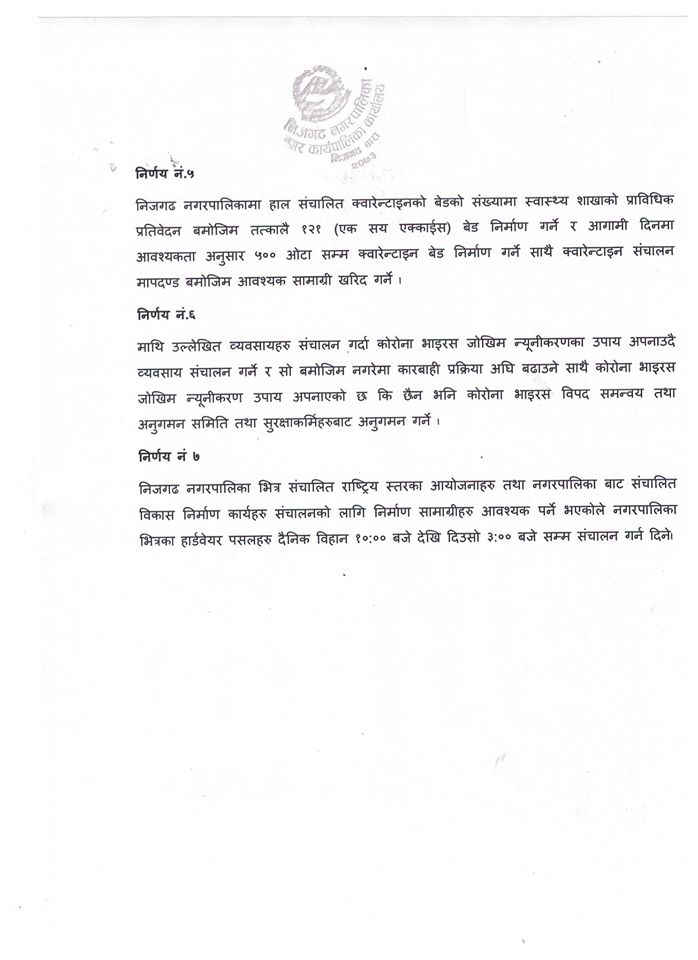यसैगरी नगर भित्र संचालित राष्ट्रिय स्तरका आयोजनाहरु तथा नगरपालिकाबाट संचालित बिकास निर्माणका कार्यहरु संचालनकोलागी निर्माण सामाग्रीका पसलहरु बिहान १० बजेदेखि ३ बजेसम्म संचालन गर्न दिईने समेत निर्णय भएकोछ ।