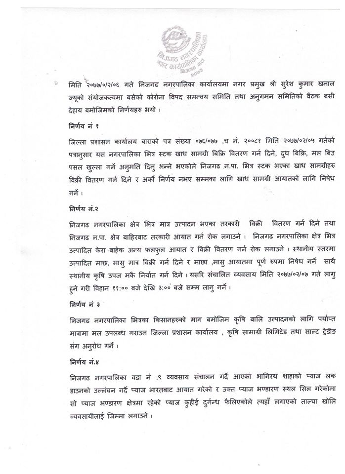बैठकले नगरभित्र रहेका स्टक सामाग्रीहरु विक्री वितरण गर्न दिने निर्णय भएको निजगढ नगरपालिकाका मेयर सुरेश कुमार खनालले निजगढ न्युजलाई बताए । अर्को निर्णय नभए सम्मकालागि सम्पूर्ण सामाग्रीहरु आयातमा प्रतिबन्ध गर्दै नगर भित्र स्टक रहेका खाध्य सामाग्री, दुध बिक्रि, मल बिउ पसल संचालन गर्न दिईने निर्णय भएको मेयर खनालले बताए ।
