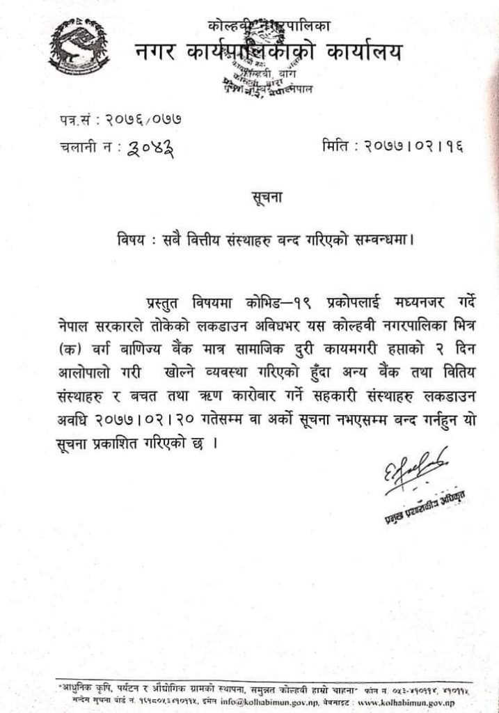 यसै विच वडा कार्यालयहरुमा भिड बढेपछी कोल्हवी नगरपालिकाले भने सुक्रबार सुचना निकालेरै क बर्गका बैंक बाहेकका वित्तिय संस्था तथा सहकारी बन्द गर्न भनेको छ ।