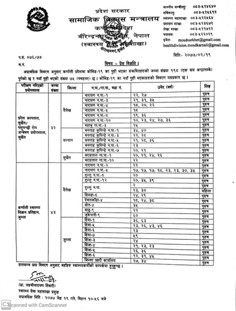 भने दैलेख दुल्लु नगरपालिकाकी २३ र ३० वर्षीया महिलासहित दैलेखका विभिन्न स्थानीय तहका २४ जनामा कोरोना संक्रमण पृष्टी भएको हो । यस्तै सुर्खेतमा परीक्षण गरिएकामध्ये दैलेख १७, सुर्खेतका ५ र सल्यानका १० जनामा कोरोना पृष्टी भएको सामाजिक विकास मन्त्रालय कर्णाली प्रदेश स्वास्थ्य महाशाखाले जनाएको छ ।
