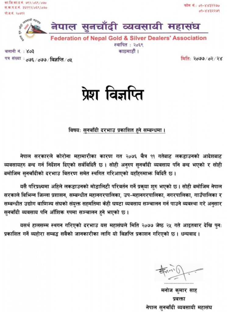 अब दैनिक रुपमा अन्तर्राष्ट्रिय बजारअनुसार सुनचाँदीको मूल्य निर्धारण गरिने महासंघले जनाएको छ। सरकारले लकडाउनको मोडालिटी परिवर्तन गर्ने प्रक्रियाअनुसार सुनचाँदी व्यवसायीले पनि आंशिक रुपमा व्यापार संचालन गर्ने जनाएको छ।