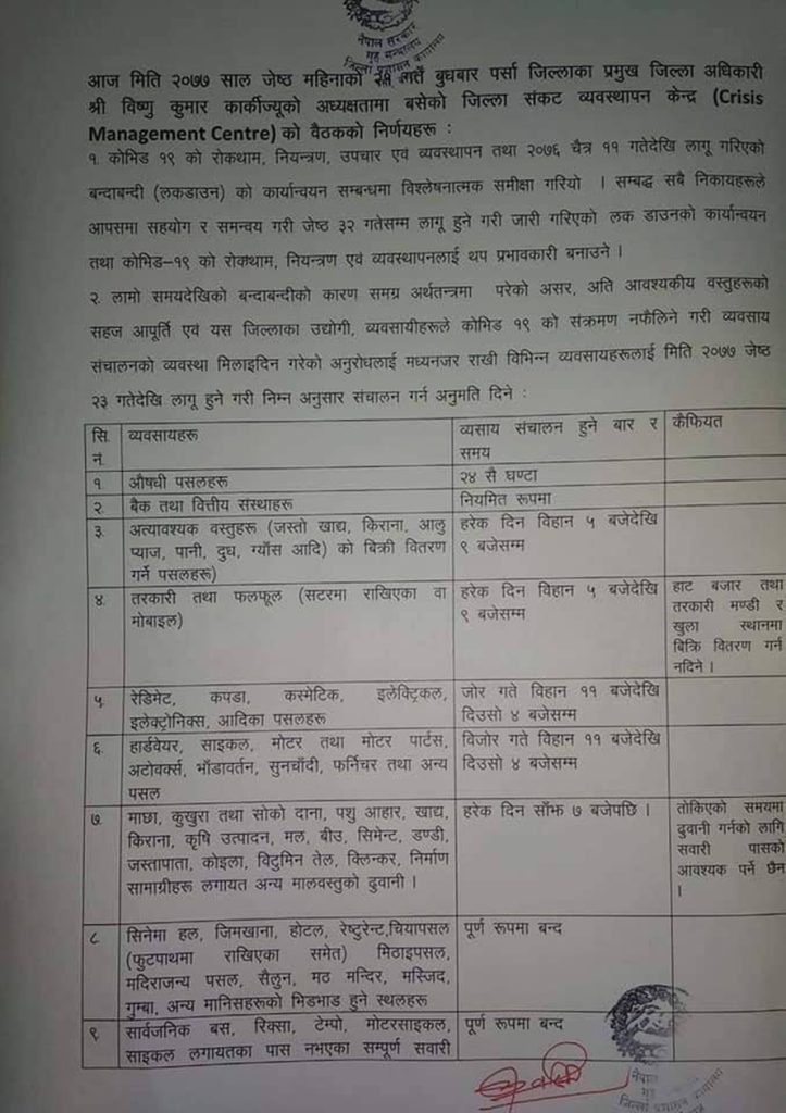 जिल्ला सुरक्षा समितिले जेठ २३ गते साँझ गरेकाे निर्णय-