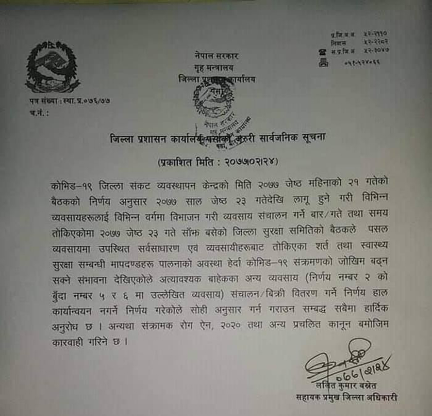 बस्नेतका अनुसार जेठ २१ गतेको निर्णय नम्बर २ को बुँदा नम्बर ५ र ६ मा उल्लेखित व्यवसाय सञ्चालन गर्न दिने निर्णय हाललाई कार्यान्वयन नगर्ने निर्णय भएको हो । उनले भने, ‘व्यवसायी र सर्वसाधरणले तोकिएको शर्त तथा स्वास्थ्य सुरक्षासम्बन्धी मापदण्डहरु पालना गरेको पाएनौं । जोखिमकाे ख्याल नै नगरी बजारमा सवारी साधन प्रयाेग गरी अनावश्यक भिडभाड गरेकाे पायौं । यसले संक्रमणको थप जाेखिम बढ्ने खतरा देखिएपछि शनिबारदेखि नै उक्त निर्णय कार्यान्वयन नगर्ने निर्णय गर्न बाध्य भएका हौं ।’