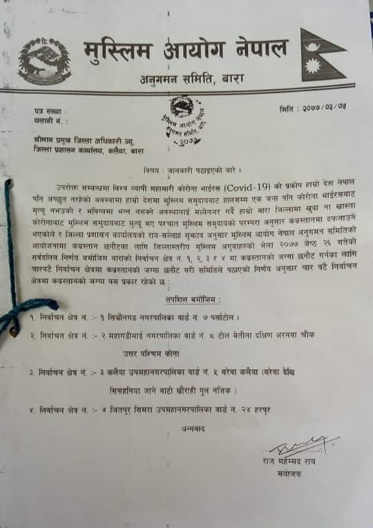जिल्लामा मुस्लिम समुदायमा कसैको कोरोना भाइरसबाट मृत्यु भएको अवस्थामा दाहसंस्कारको लागि मुस्लिम आयोग नेपाल अनुगमन समिति बाराले जिल्लाका ४ ओटै निर्वाचन क्षेत्रमा १÷१ स्थानमा कब्रस्थान बनाउने निर्णय गरेको छ ।