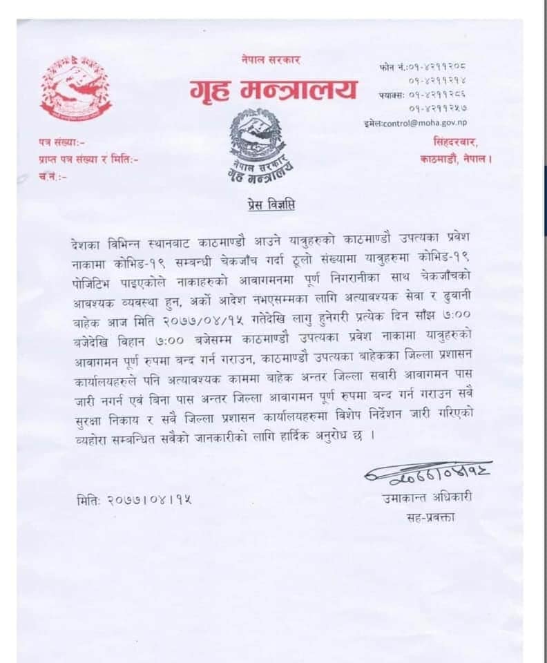 राजधानी उपत्यकामा कोरोना सक्रमित बढ्न थालेपछि गृह मन्त्रालयले काठमाडौं उपत्यकामा साँझ ७ बजेदेखि बिहान ७ बजेसम्म प्रवेशमा पूर्ण रुपमा प्रतिबन्ध लगाएको छ। उक्त निर्णय बिहीबार साँझदेखि लागु गरिएको गृह मन्त्रालयले जानकारी दिएको छ ।