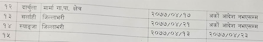 त्यस्तै महोत्तरीको जलेश्वर नगरपालिका र महोत्तरी गाउँपालिका क्षेत्र, धनुषाको जनकपुरधाम उपमहानगरपालिका र क्षीरेश्वरनाथ नगरपालिका, नुवाकोटको सदरमुकाम क्षेत्र, बझाङको थलारा गाउँपालिका–५ र केदारस्यू गाउँपालिका ६ र ७ मा निषेधाज्ञा लगाइएको छ ।