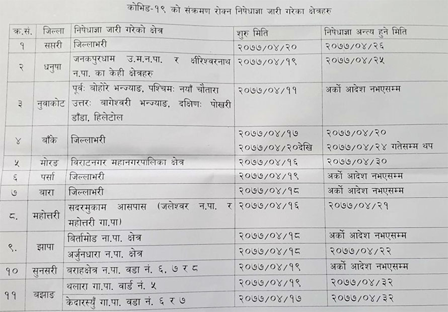 गृह मन्त्रालयका अनुसार सप्तरी, धनुषा, नुवाकोट, बाँके, मोरङ, पर्सा, बारा, महोत्तरी, झापा, सुनसरी, बझाङ, दार्चुला, सर्लाही र स्याङ्जा जिल्लाका विभिन्न क्षेत्रमा निषेधाज्ञा जारी गरिएको छ ।