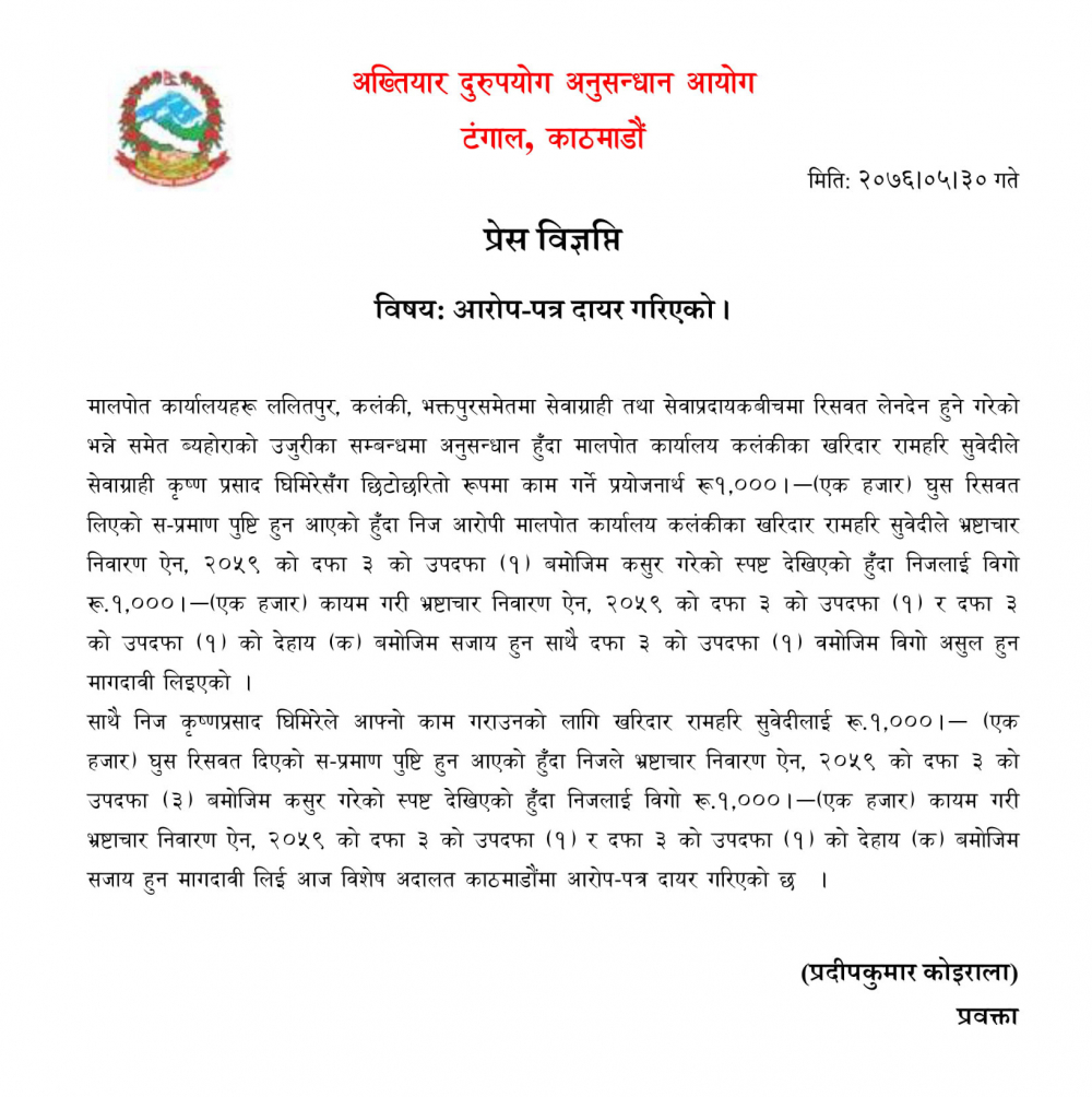 अख्तियारले गत वर्षदेखि घुस बुझाउनेले सूचना नदिए पनि आफैंले निगरानी गर्ने र घुस लिए/दिएको देखिए भ्रष्टाचार मुद्दा चलाउने अभियान थालेको थियो । त्यसै क्रममा गत साउनमा कलंकी मालपोतबाट केही दिनको सीसीटीभी फुटेजको रेकर्ड उठाएर ल्याएको थियो । त्यस क्रममा सुवेदीले सेवाग्राही कृष्णप्रसाद घिमिरेसँग एक हजार रुपैयाँ लिएको दृश्य देखिएको भन्दै अख्तियारले उनलाई झिकायो ।