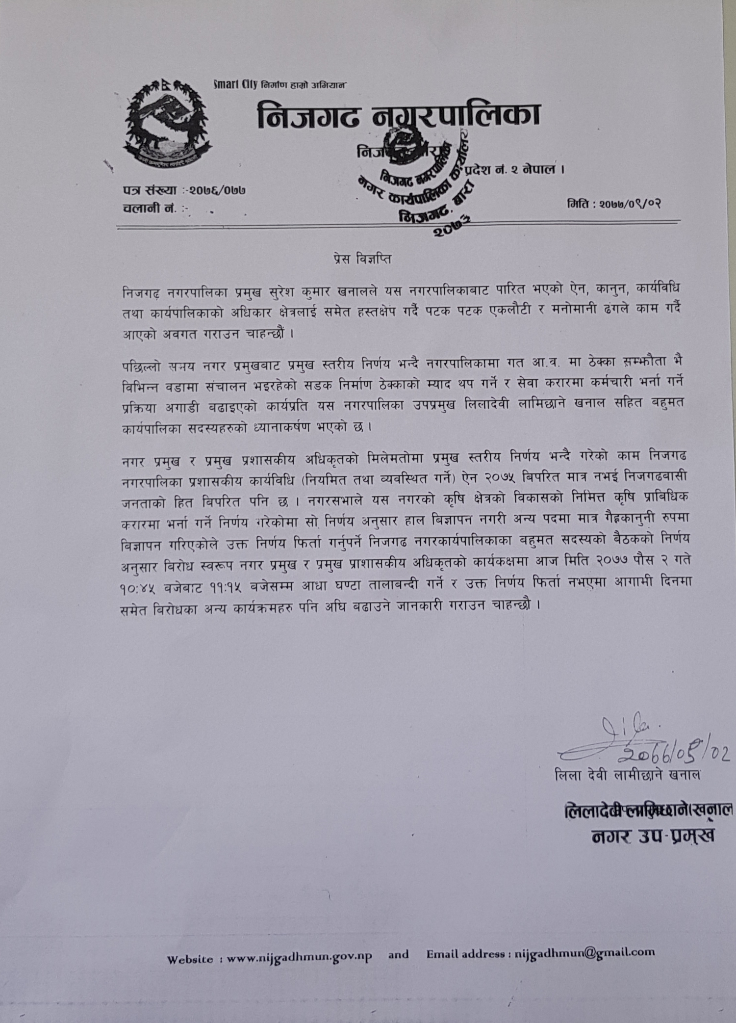 नगर प्रमुख खनाल र प्रमुख प्रशासकीय अधिकृत कार्काीको मिलेमतोमा प्रमुख स्तरीय निर्णय भन्दै गरेको काम निजगढ नगरपालिका प्रशासकीय कार्यविधि (नियमित तथा व्यवस्थित गर्ने) ऐन २०७५ बिपरित मात्र नभई निजगढबासी जनताको हित बिपरित भएको विज्ञप्तिमा उल्लेख गरिएको छ ।