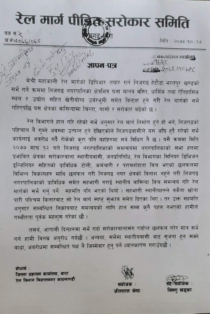 समितका संयोजक श्रेष्ठ र सहसंयोजक विष्णु खडकाले हस्ताक्षर गरेर बुझाइएको ज्ञापन पत्रमा निजगढ–हेटौडा–भरतपुर खण्डको सर्भे गर्ने क्रममा निजगढ नगरपालिका क्षेत्रभित्रको घनावस्ति, धार्मिक तथा ऐतिहासिक स्थल र उद्योगसहित उर्वरभूमीसमेत विनास हुने गरी रेल्वे लाइनको सर्भे गरिएपछि यस क्षेत्रका बासिन्दामा चिन्ता, चसो र सरोकार बढेको बताइएको छ ।