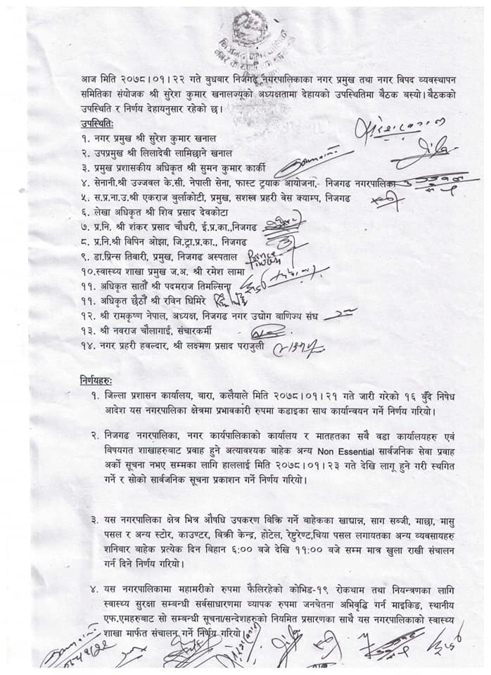 आज निजगढ नगरपालिकाको बसेको कोरोना भाइरस रोकथाम, अनुगमन तथा व्यवस्थापन सम्वन्य समितको बैठकले सो निर्णय गरेको हो । समितका संयोजक मेयर सुरेशकुमार खनालको सभापतित्वमा आज सम्पन्न भएको बैठकले ४ बुदे निर्णय गरेको छ ।