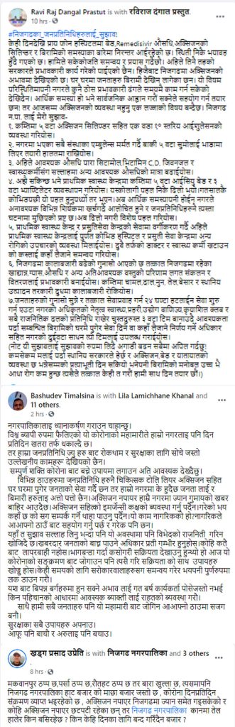 निजगढमा अक्सिजन सिलिन्डरको अभाव भएको खबर बिहिर आएसंगै निजगढमा रहेका राजनीतिकर्मीले समेत आवाज उठाएका छन् । निजगढ नगरपालिकाले नगरबासीको स्वास्थ्य माथि गैरजिम्मेवारीपन प्रदर्शन गरेको उनीहरुको आरोप छ ।