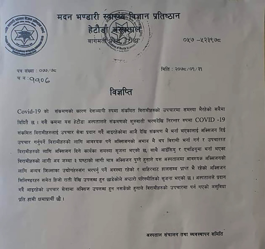 मदनभण्डारी स्वास्थ्य विज्ञान प्रतिष्ठान हेटौंडा (हेटौंडा अस्पताल) अक्सिजनको अभाव भएर थप बिरामी भर्ना गर्न र भर्ना भएकाहरुको उपचार गर्न समस्या परेको बताएको छ ।