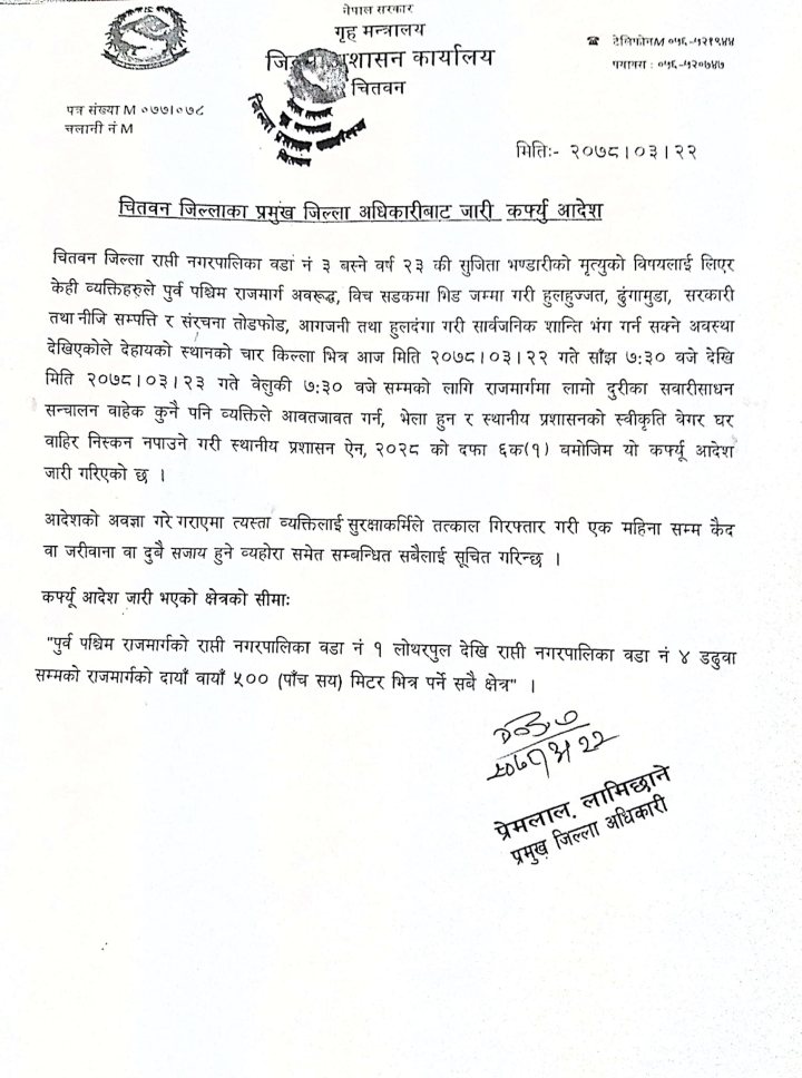 राप्ती–३ चितवनकी सुजिता भण्डारीको मृत्युलाई लिएर हुन सक्ने हिंसात्मक झडपलाई मध्यनजर गर्दै कर्फ्ष्यू जारी गरिएको प्रमुख जिल्ला अधिकारी प्रेमलाल लामिछानेले जानकारी दिनुभयो ।