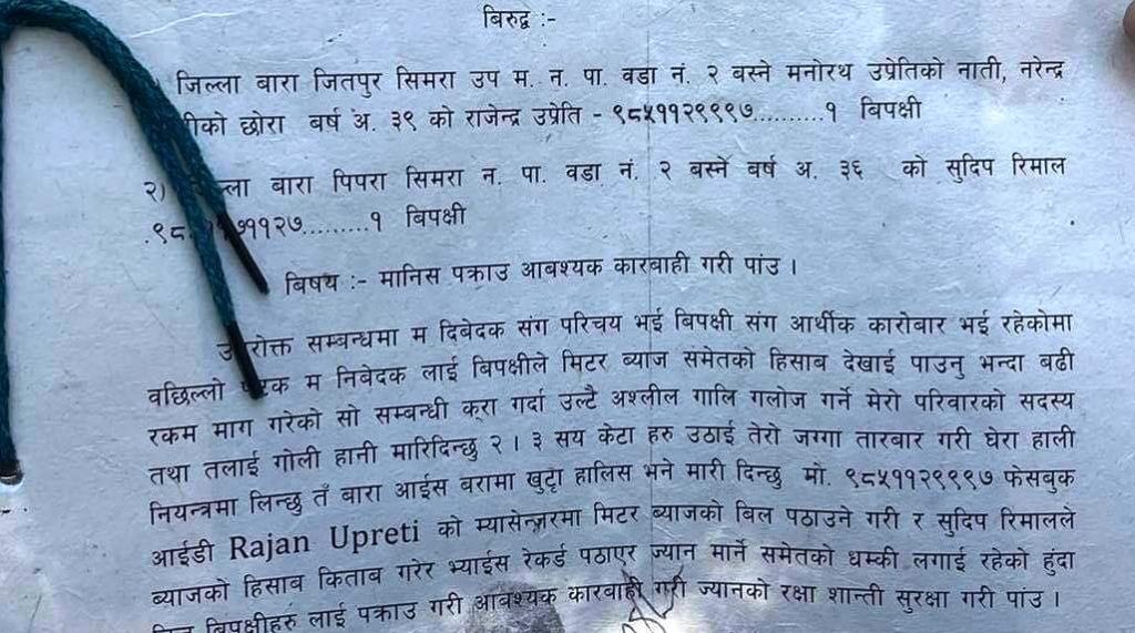 बारा जितपुरसिमरा उपमहानगरपलिका वडा नम्बर २ घर भएका सुदिप रिमाल यस क्षेत्रका चर्चित मिटर ब्याजी रहेको पाइएको छ । उनी सँगै अर्का एक पिपरा सिमराका राजेन्द्र उप्रेती समेत सहकार्य गर्दै आएको पाइेको छ । जस मध्य रिमालले आफु सँगै आर्थिक करोबार गर्ने सोझा साझा मनिसलाई सहयोग गरेको झै गरी केही रकम सरसापोटी दिने र पछी उक्त रकममा मिटर ब्याज लगाउने गरेका छन भने उप्रेती मिटर ब्याजको पैसा तिर्न भन्दै धम्काउने र ज्यान मर्ने समेत धम्की दिने गरेको देखिएको छ ।
