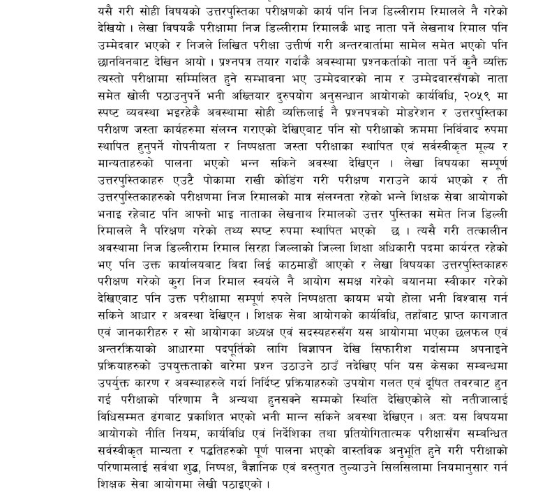 अख्तियारले त्यतिबेला त्यो परीक्षा सम्पूर्ण रुपले निष्पक्षता कायम भयो होला भनी विश्वास गर्न सकिने आधार र अवस्था देखिएन भन्ने निचोड निकाल्दै ‘परीक्षाको परिणामलाई सर्वथा शुद्ध, निष्पक्ष, वैज्ञानिक एवं वस्तुगत तुल्याउने सिलसिलामा नियमानुसार गर्न’ आयोगलाई पत्राचार गरेको थियो ।