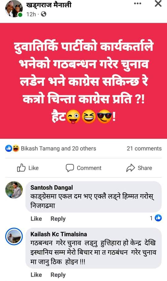 गठबन्धनमा रेहेका दलहरुबिच तालमेलको अन्तीम चरणमा पुगेको बेलामा दंगालले सामाजिक सञ्जालमा नेपाली काग्रेस पार्टीबाट निजगढमा मेयरका प्रत्याशी मध्य एक खड्गराज मैनालीको स्टाटसमा टिप्पणी गर्दै दंगालले चुनैती शैलीमा काङ्ग्रेसमा एकल दम भए एक्लै लड्ने हिम्मत गरोस् निजगढमा लेखेका छन ।