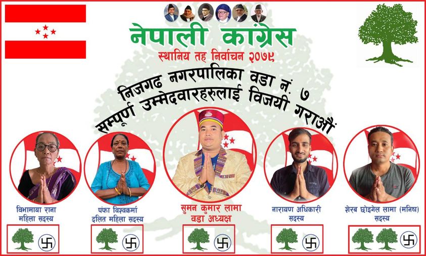 चुनावी प्रचारको पर्चामा कांग्रेस ७ ले आफ्ना उम्मेदवारको तस्बिरसहित रुख चिह्नमा स्वस्तिक छाप लगाएर वितरण गरिरहेको कांग्रेसका एक नेताले बताएका छन ।