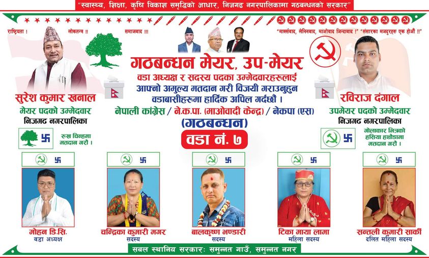निजगढ : निजगढ नगरपालिकाको वडा नम्बर ७ मा कांग्रेस-माओवादी गठबन्धनविरुद्ध कांग्रेसनै लागेको छ । कांग्रेसका बागी उम्मेदवारलाले रुख चिन्ह पाएपछि अहिले दुबै कांग्रेस-माओवादी गठबन्धन र कांग्रेसको छुटाछुटै पर्चा बनाएर प्रचारप्रसारमा छन ।