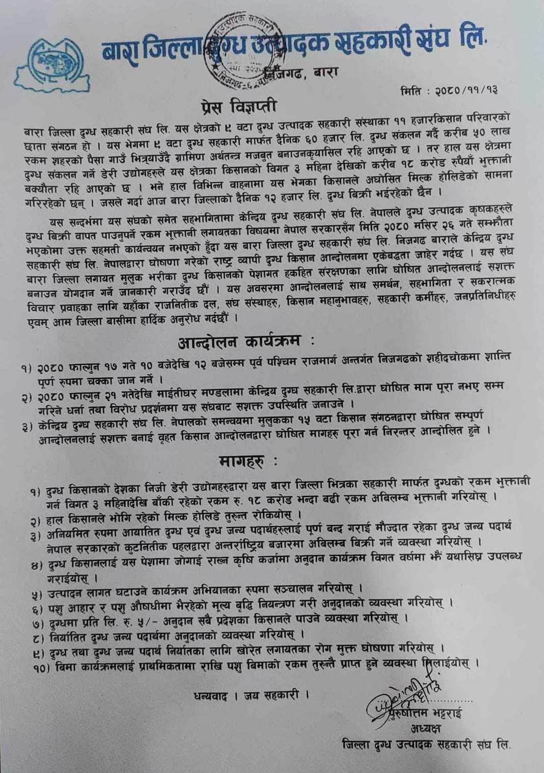 संघले आइतवार बाराको निजगढ नगरपालिकाको सभा हलमा पत्रकार सम्मेलन गर्दै दुध उत्पादक किसानको माग सम्बोधन नभएकाले आन्दोलनमा उत्रिन बाध्य भएको जनाएको छ ।