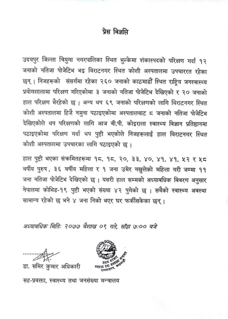 उदयपुरको त्रियुगा नगरपालिका क्षेत्रका वासिन्दामा कोरोना संक्रमण जाँच गर्दा काठमाडौंको राष्ट्रिय जनस्वास्थ्य प्रयोगशालामा ३ जना र धरानको बीपी कोइराला स्वास्थ्य विज्ञान प्रतिष्ठानमा ८ जनामा कोरोना संक्रमण पुष्टि भएको स्वास्थ्य तथा जनसंख्या मन्त्रालयका प्रवक्ता डा. विकास देवकोटाले जानकारी दिए ।