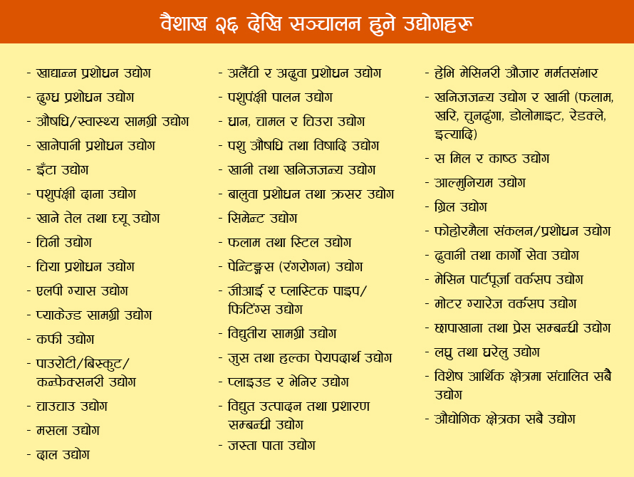 सरकारले खाद्यान्न र अन्य अत्यावश्यक वस्तु उत्पादन गर्नेसहित ४२ प्रकारका उद्योग सञ्चालनमा ल्याउने निर्णय गरेको छ ।