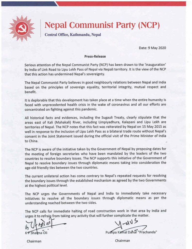 सत्तारुढ नेकपाका अध्यक्षद्वयको संयुक्त हस्ताक्षरमा पार्टीका तर्फबाट शनिबार साँझ जारी गरिएको विज्ञप्तिमा भारतको कदमप्रति आपत्ति जनाइएको छ ।