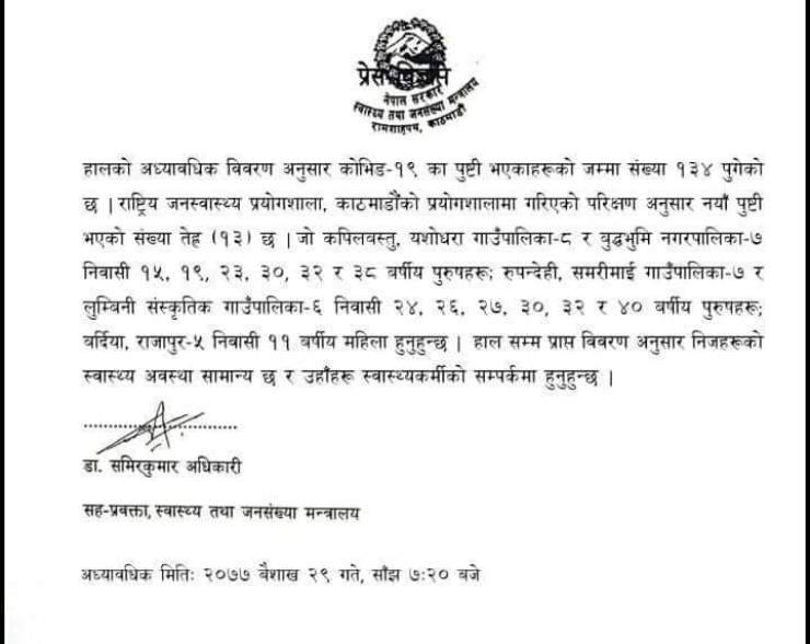उनीहरुको राष्ट्रिय जनस्वास्थ्य प्रयोगशालामा गरिएको परीक्षणमा कोरोना संक्रमण पुष्टि भएको मन्त्रालयका सहप्रवक्ता डा. समीरकुमार अधिकारीले जानकारी दिए ।
